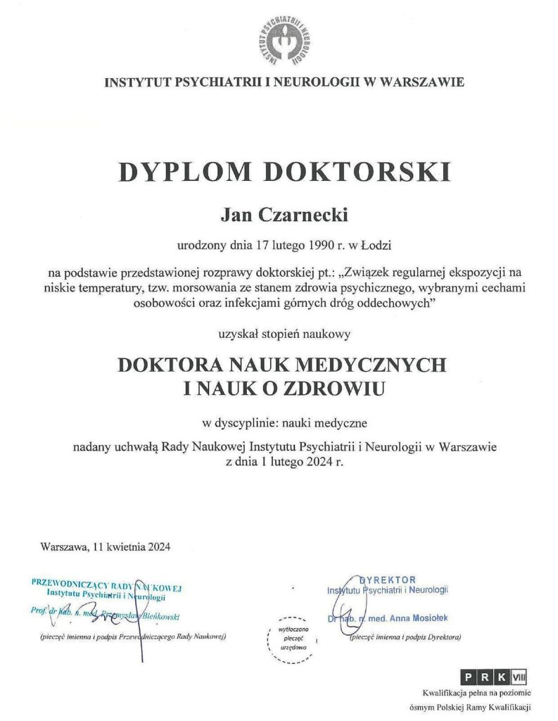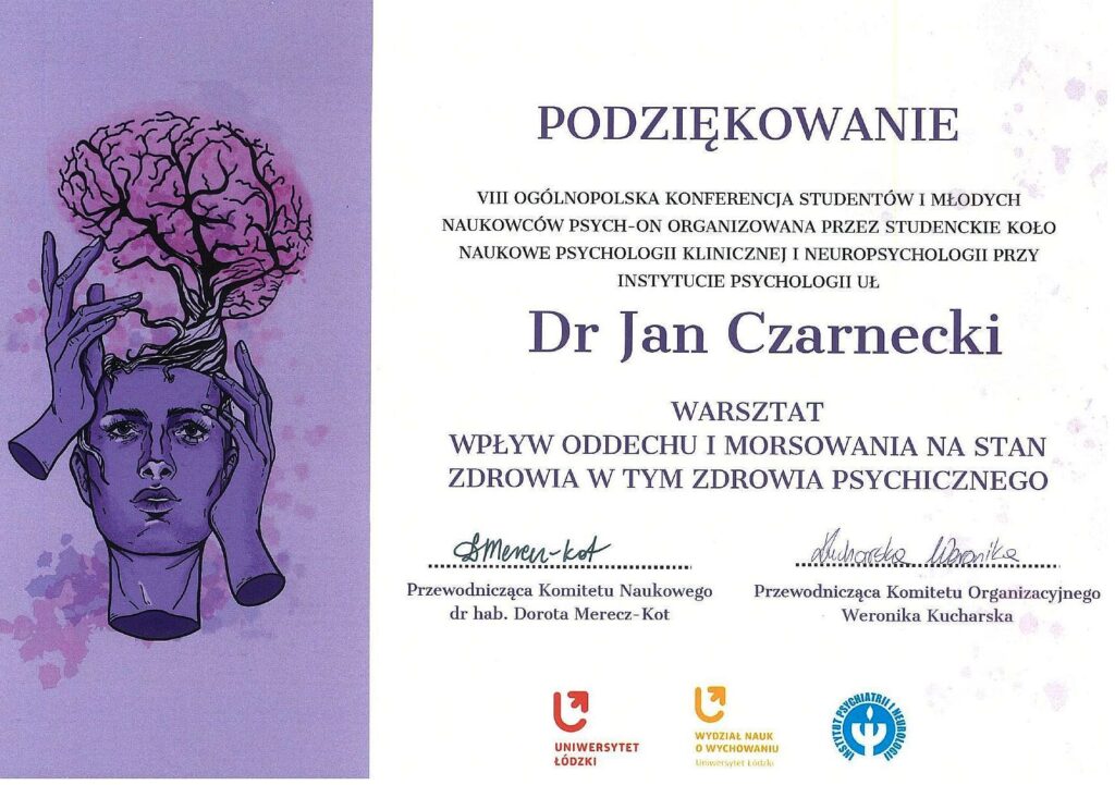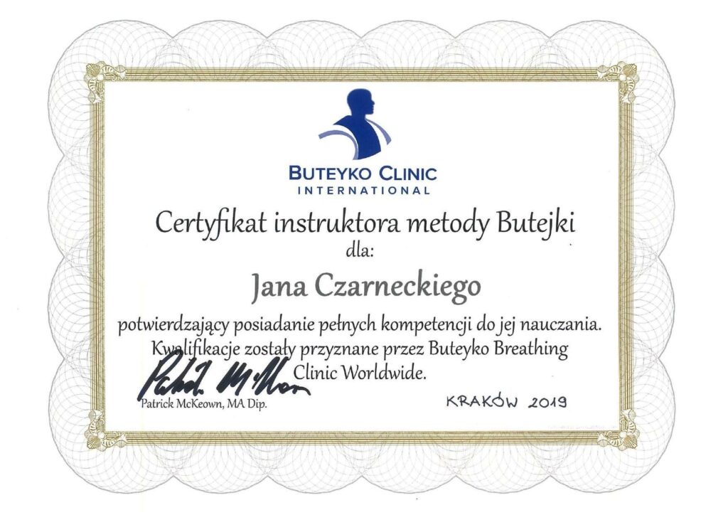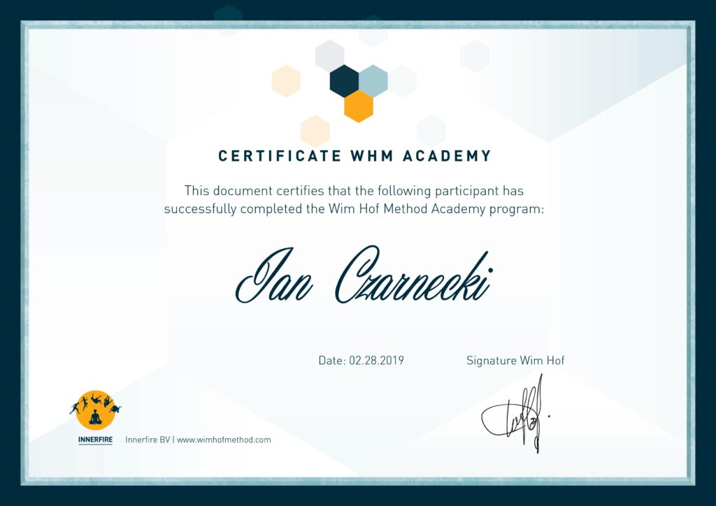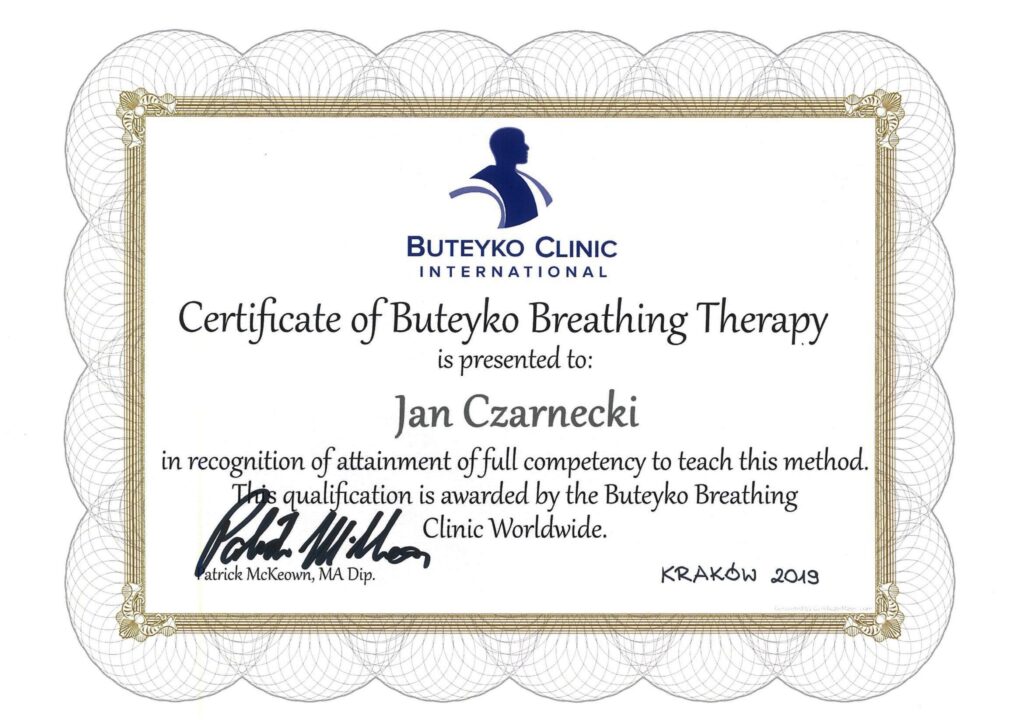 Jest certyfikowanym instruktorem Metody Butejki (2019) oraz absolwentem szkolenia instruktorskiego Metody Wima Hofa® (2017), co dodatkowo potwierdza jego umiejętności w zakresie poprawy samopoczucia i zdrowia poprzez kontrolowane ekspozycje zimno.