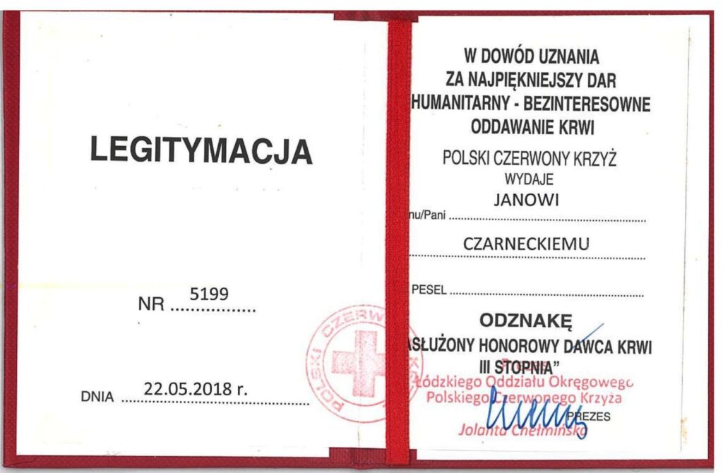 Jest dumnym posiadaczem brązowej odznaki honorowej „Zasłużony Honorowy Dawca Krwi III stopnia”.